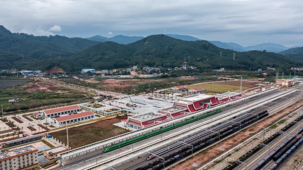 冬日暖陽裏,雲南省西雙版納傣族自治州勐臘縣中老鐵路磨憨站一派熱鬧景象,一列列國際貨物列車汽笛嘹亮,呼嘯奔馳於中國和老撾間。