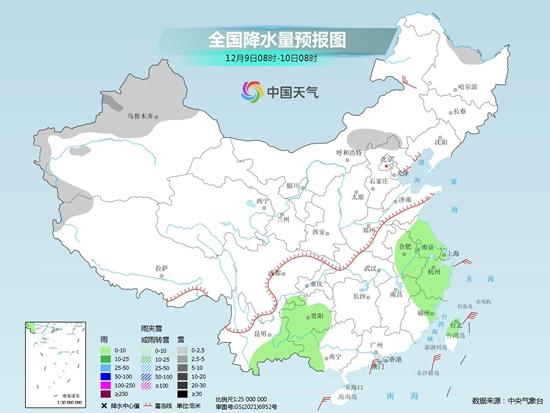 中央氣象台預計,今天新疆南疆西部山區等地部分地區有小雪。安徽南部、江蘇中南部、上海、江西東北部、浙江、四川盆地東南部、貴州中西部、雲南東部和南部、廣西西部、海南島東北部等地部分地區有小雨。