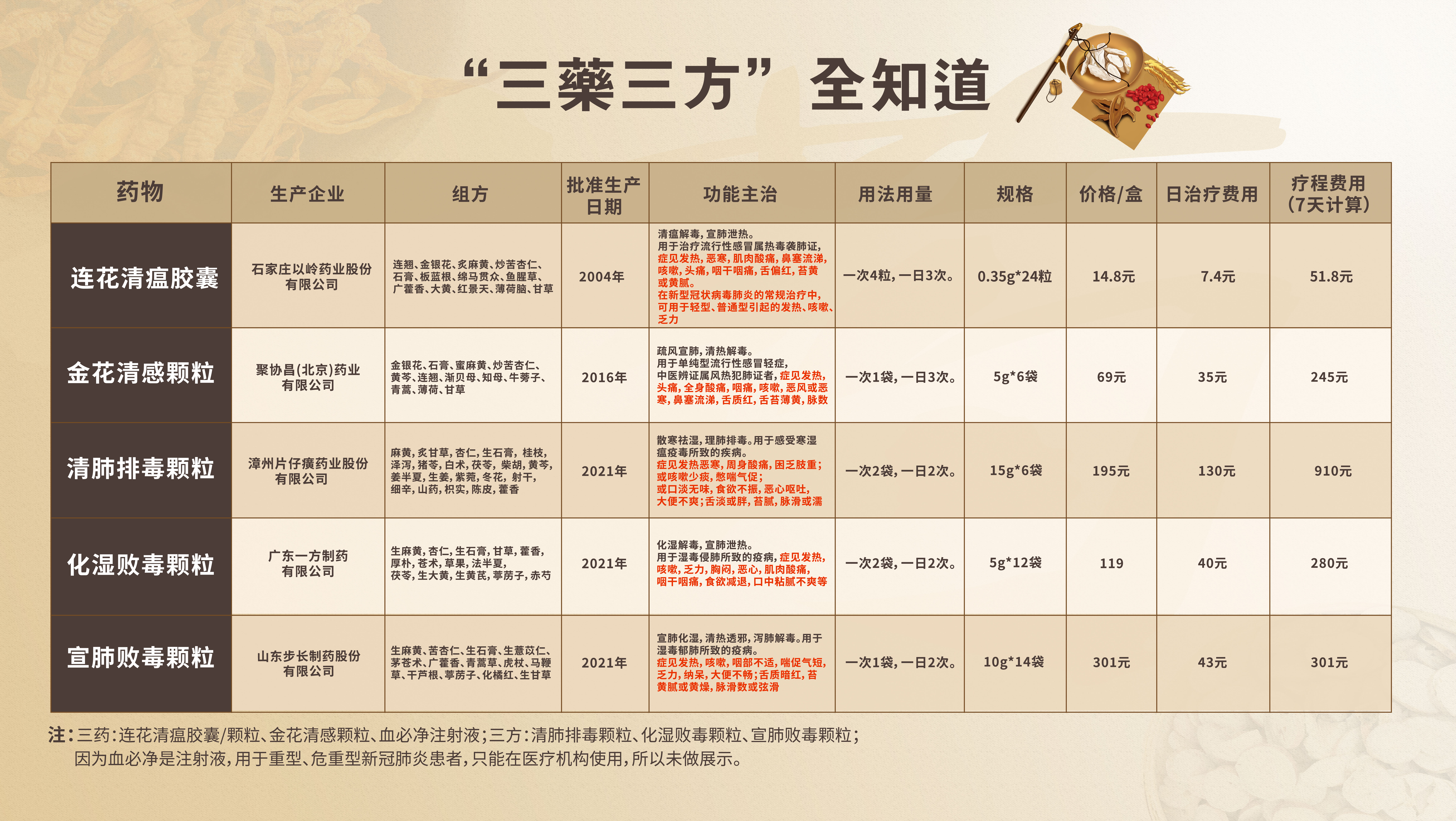 三年來,在國內新冠患者救治中,國務院應對新冠肺炎聯防聯控機制科研攻關組篩選出的“三藥三方”,在疫情防控中發揮了重要作用。這“三藥三方”分別是:連花清瘟膠囊、金花清感顆粒、血必淨注射液、清肺排毒湯、化濕敗毒方、宣肺敗毒方。在2021年“三方”也獲批上市,“三方三藥”就變成了“六藥”。