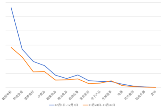 鞋服布料是“千年商都”廣州的重要產業之一,也是過去一兩個月受創最為嚴重的產業之一。12月1日至12月7日廣州鞋服布料的單量環比增長了100%以上,每日有近2萬單在運鞋服布料。在此期間廣州完單量最大的前三大專業市場,其中就有2個是服裝類專業市場——十三行服裝批發市場和廣州沙河服裝市場。除了鞋服布料,廣州其他增幅較大的貨物類型為家居家裝、裝修建材、電器,增幅分別達到72%、66%、65%。