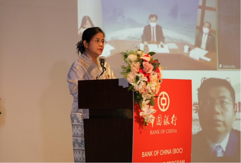 丹丹瑞行長等致辭感謝獎助學金項目,表示項目惠及受益學生,支持緬人力資源建設,服務經濟社會發展,增進緬中兩國友誼。中國銀行仰光分行積極參與緬中合作,為緬甸經濟金融發展提供助力,緬方予以高度評價。