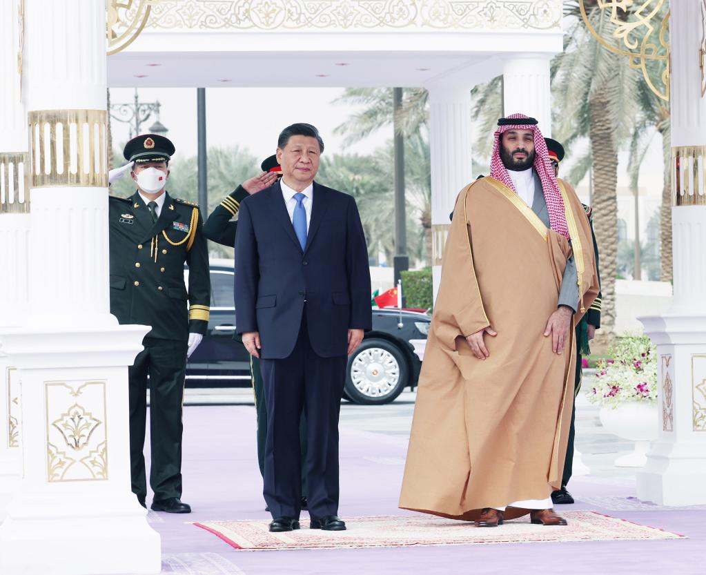 歡迎儀式後,習近平在利雅得王宮同穆罕默德王儲舉行會談。習近平指出,當前國際和地區形勢深刻複雜演變,中沙關係的戰略性和全局性更加凸顯。中方把發展對沙特關係置於外交全局尤其是中東外交的優先方向,願同沙方推動中沙全面戰略伙伴關係得到更大發展。