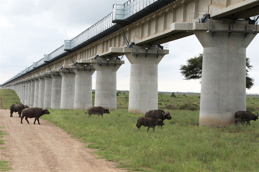 在“一帶一路”建設中,生物多樣性保護成為重要內容。中非共建的肯尼亞內馬鐵路是其中典型。該鐵路採用特大橋全程穿越內羅畢國家公園方案,最低橋墩也超過6米,讓長頸鹿也能“昂首通過”;特大橋護欄兩側安裝聲屏障,極大降低火車通過時的噪音。
