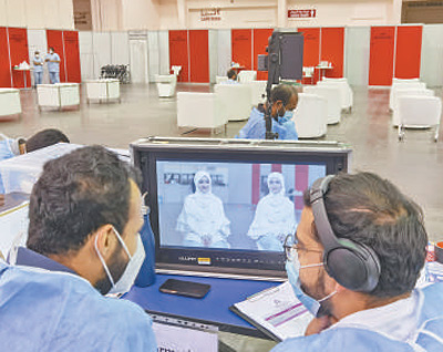 由中國國藥集團與巴林政府共同成立的國際臨牀研究中心,坐落在巴林王國首都麥納麥的巴林國際會展中心。在臨時設置的10多個房間裏,醫療技術人員正在為報名參與試驗的志願者掃碼、打卡、解釋流程等,就抗新冠病毒單克隆抗體鼻用噴霧劑(以下簡稱“單抗F—61”)在巴林的臨牀應用進行研究。