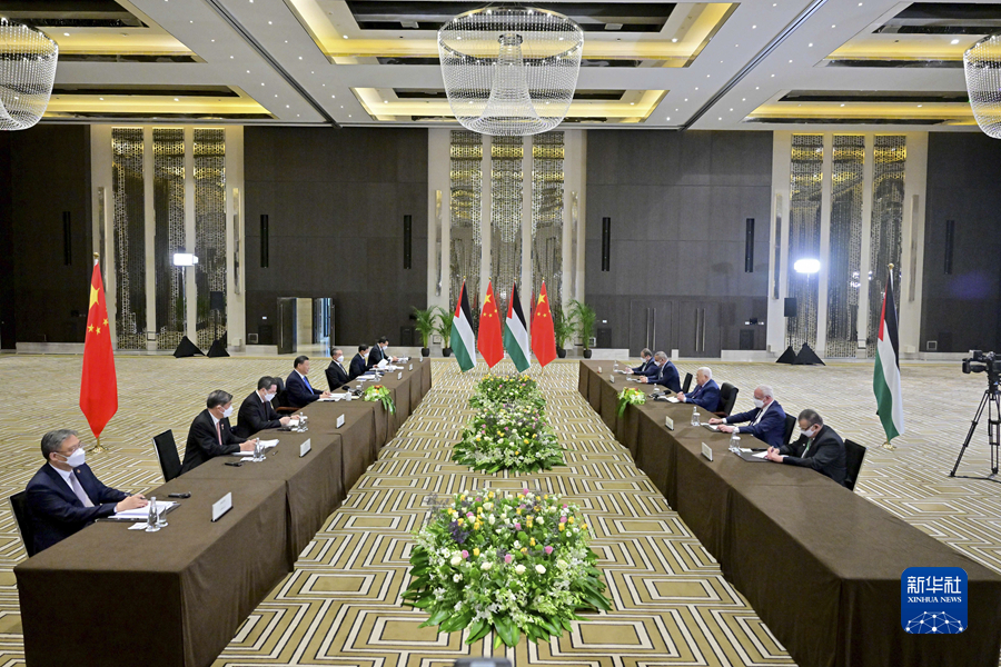 阿巴斯表示,巴勒斯坦人民對同中國人民的友好關係深感自豪。中國是巴勒斯坦真誠和可信賴的朋友,始終堅定支持巴勒斯坦人民的正義事業,在政治、經濟、道義等各方面均給予巴方全面、無條件支持,全體巴勒斯坦人民都對中國人民懷有誠摯感情。中方在國際場合秉持的立場正義公道,提出的倡議主張積極且富建設性,巴方堅定同中國站在一起。巴方將繼續堅定恪守一箇中國原則,堅定支持中方在涉台、涉港、涉疆等問題上的正當立場,堅定支持並積極參與共建“一帶一路”,願同中方繼續加強各領域合作。巴方期待同中方一道,推動明天舉行的首屆阿中峯會取得成功。