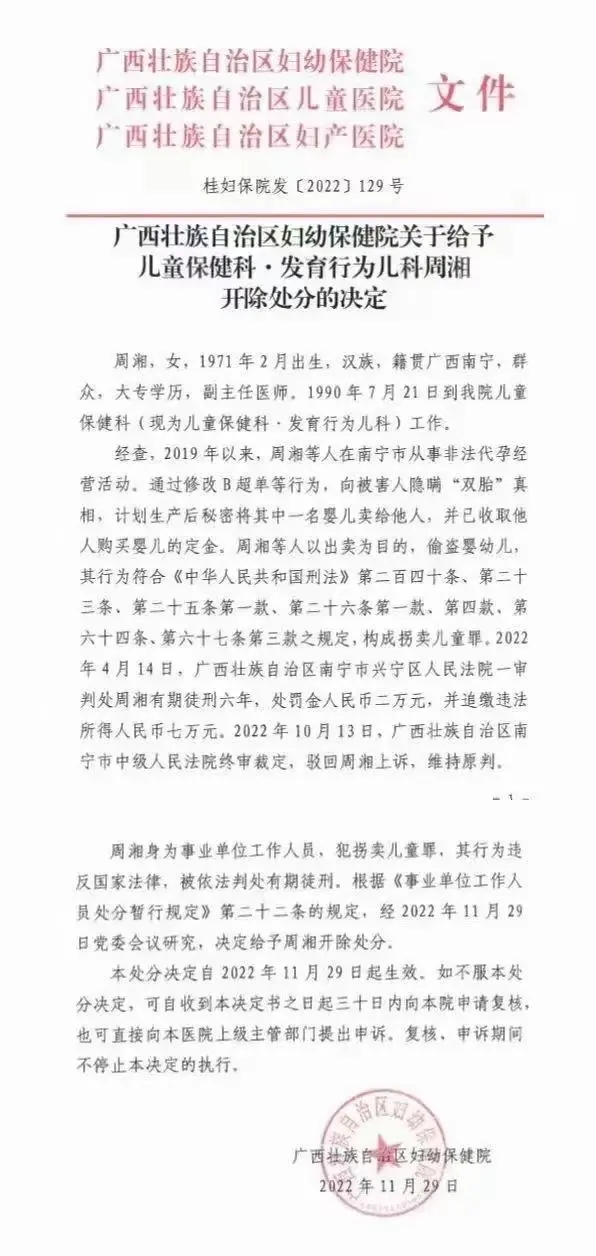 上述開除決定稱,廣西婦幼保健院兒童保健科副主任醫師周湘(1971年出生)等人自2019年以來,在南寧市從事非法代孕經營活動。周湘通過修改B超單等行為,向產婦及家屬隱瞞“雙胞胎”真相,計劃生產後秘密將其中一名嬰兒賣給他人,並已經收取他人購買嬰兒的定金。周湘等人以出賣為目的,偷盜嬰幼兒,其行為構成拐賣兒童罪。2022年4月14日,廣西南寧市興寧區人民法院一審判處周湘有期徒刑6年,處罰金2萬元,並追繳違法所得7萬元。2022年10月23日,南寧中院駁回周湘上訴,維持原判。