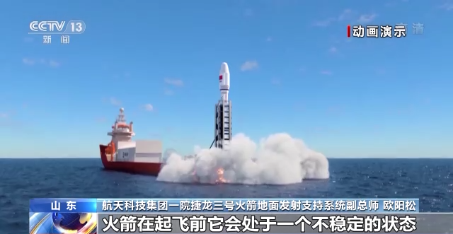 *航天科技集團一院捷龍三號火箭地面發射支持系統副總師 歐陽松:*傳統熱發射在陸地上,它是個比較平穩的平台。地面是平的,在海浪環境下船是搖晃的,火箭在起飛前會處於不穩定的狀態,會出現滑倒、橫移甚至傾翻這種事故,所以海上發射要重點解決這個問題。