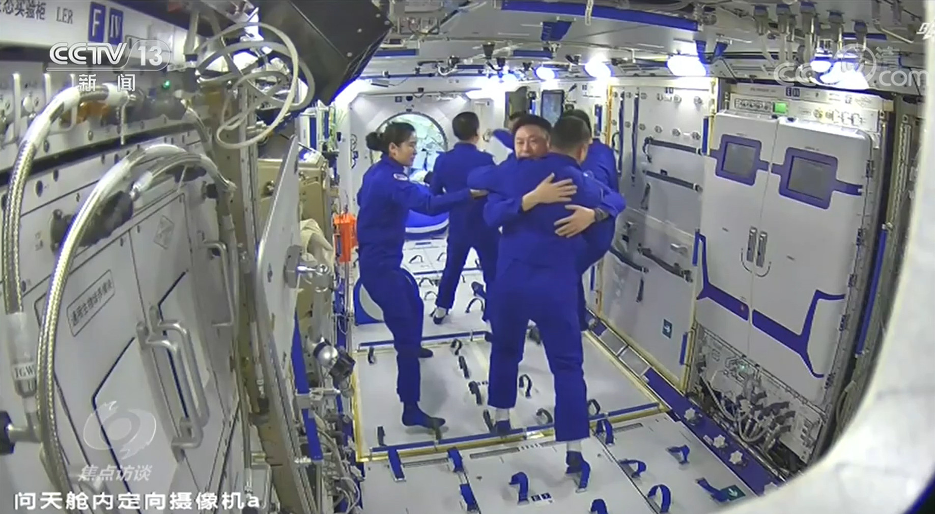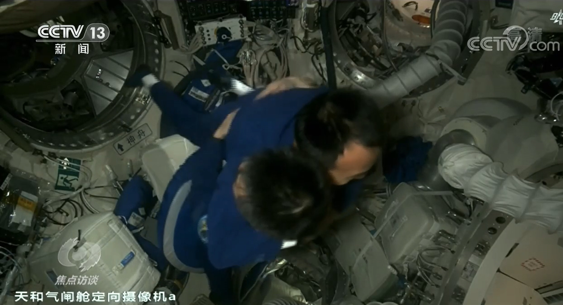 擁抱,緊緊的擁抱,在離地面約400公里的太空軌道,中國第一個在太空翻跟頭的航天員費俊龍時隔17年後再上太空,熱情地跟迎接他的蔡旭哲擁抱在一起,差點又翻了一個跟頭。問天實驗艙裏洋溢着歡樂的氣氛。
