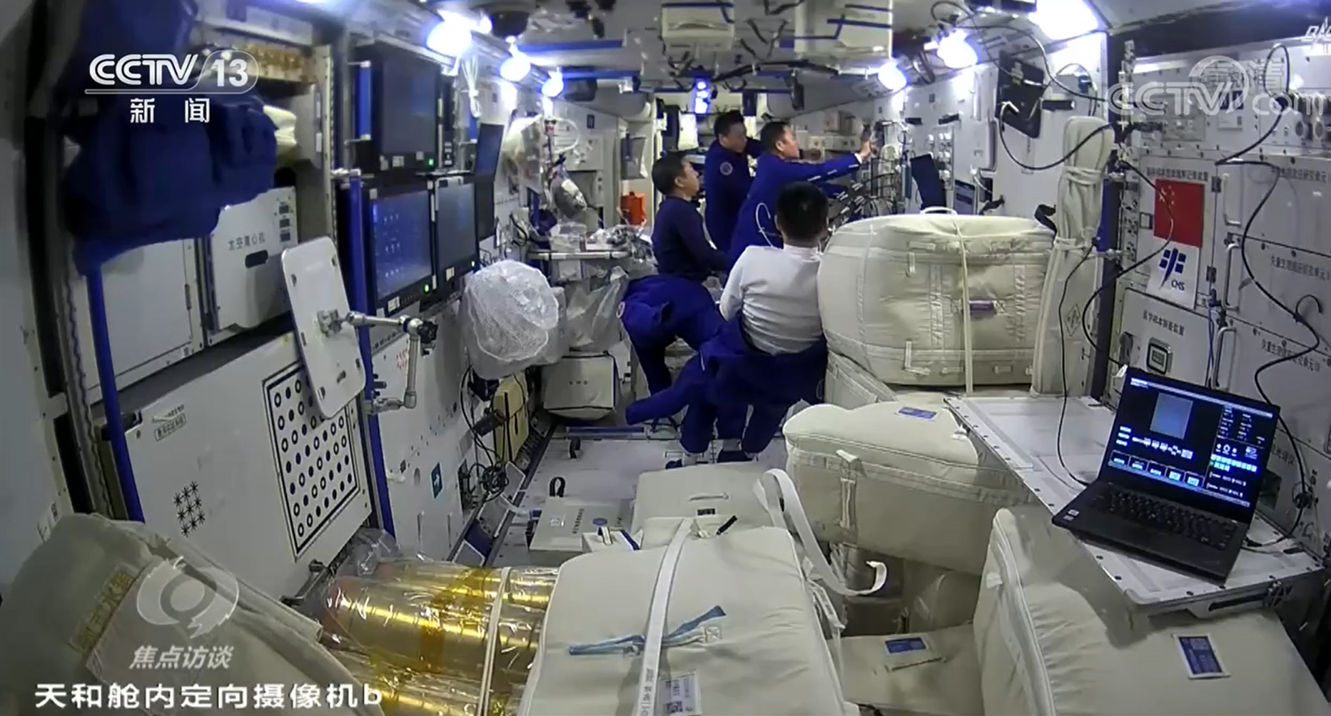 神十四乘組的航天員們為剛到的同事們拿出新的被褥開始鋪牀。6名航天員同時在空間站裏生活工作,空間如何保證?在已經完成三艙“T”字型基本構造的空間站裏,早就準備好的生活空間派上了用場,在問天實驗艙裏,航天員們都能享受到和核心艙一樣的居住條件。
