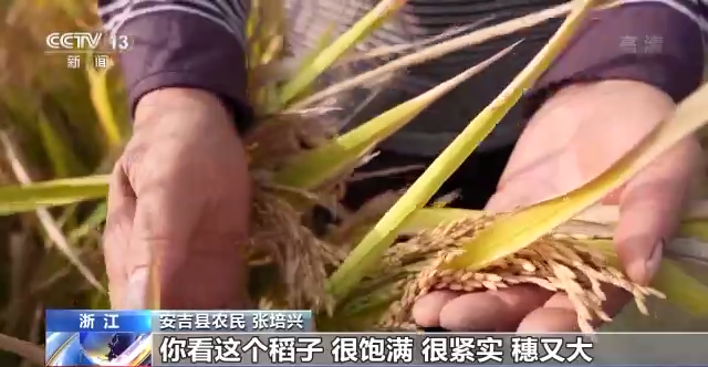 *浙江省安吉縣農民 張培興:*你看這個稻子,很飽滿、緊實,穗又大,稻子千粒重也比往年要重。已經到達我的預期了,我很開心。