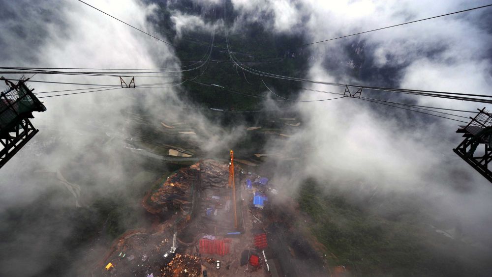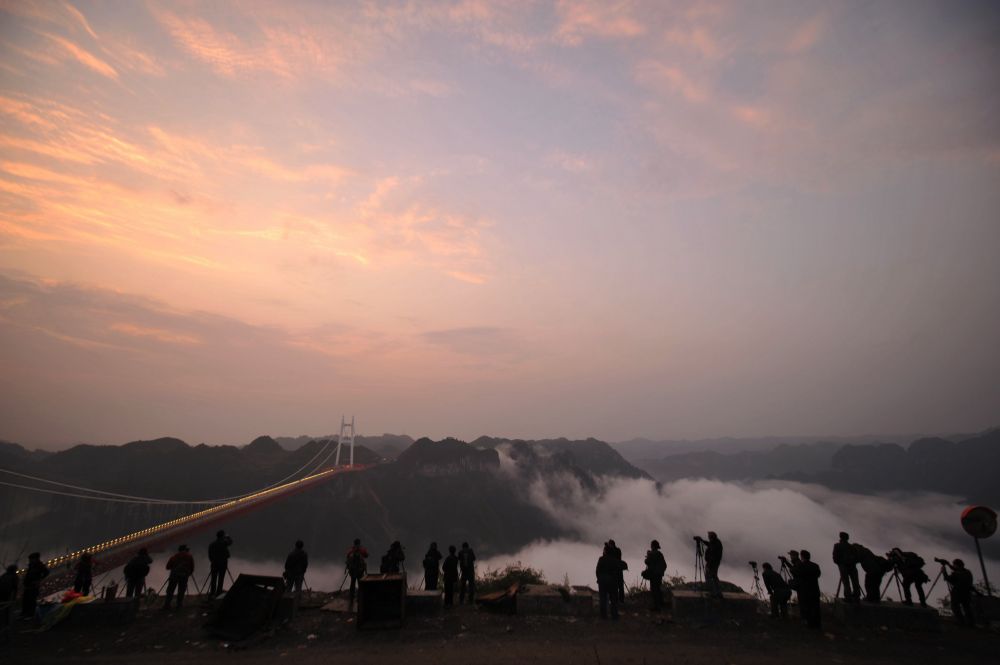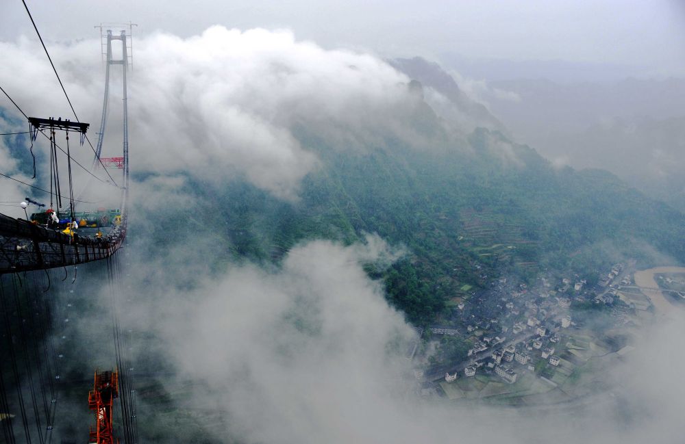 2011年初秋,大橋剛剛完成懸索安裝時,我登上施工“貓道”。雖明知安全無虞,但站上去的那一刻,山風勁猛,深溝險壑間雲霧翻滾,我還是被嚇到,雙腿不受控制地開啓“震動”模式。適應了很長一段時間,我才漸漸擺脱恐懼,走向大橋中間,近距離拍攝施工現場。