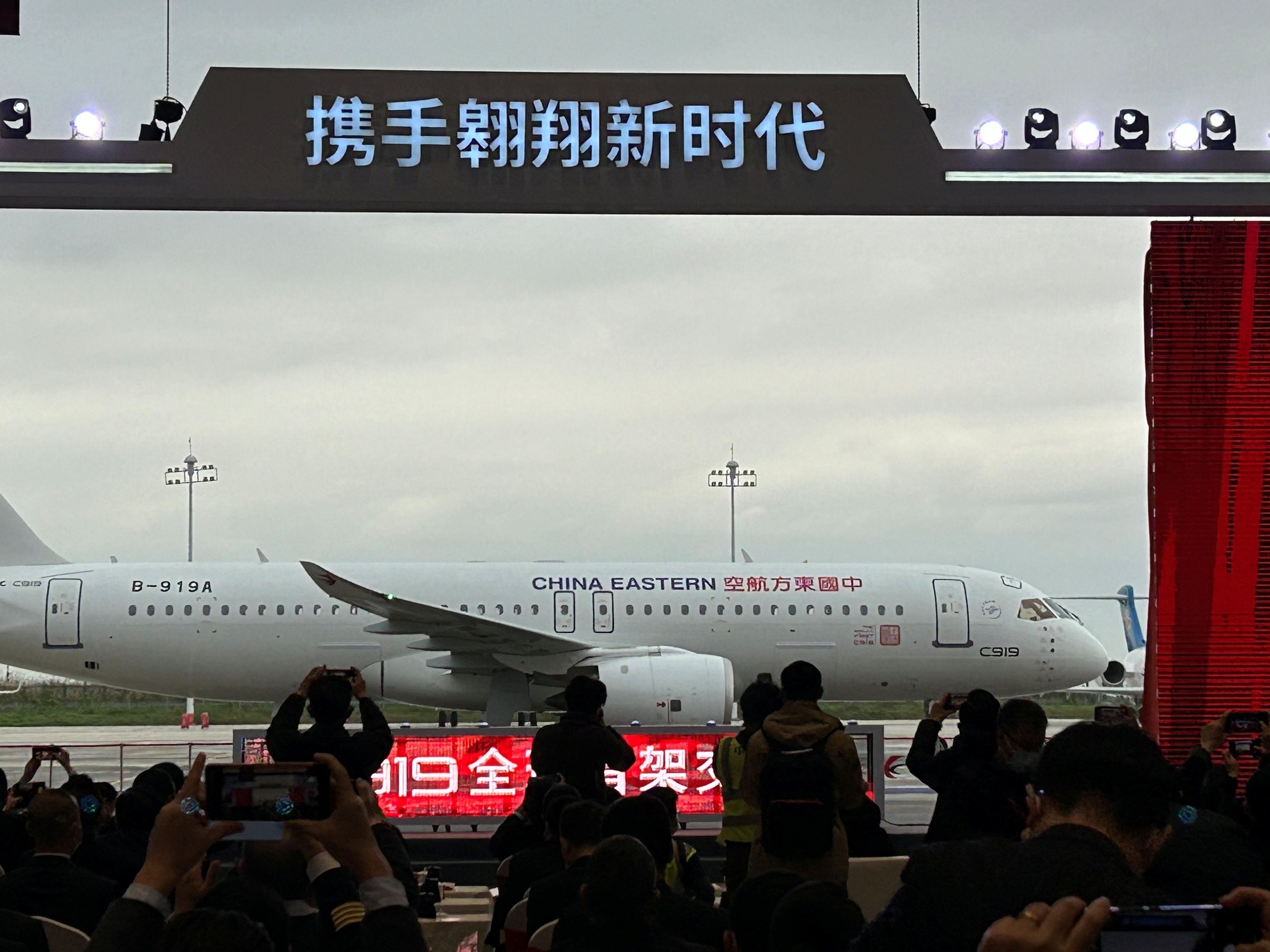 在當天的交付環節,中國商飛向中國東航交付“C919全球首架紀念鑰匙”,頒發飛機銷售證;中國民航局向中國東航頒發國籍登記證、單機適航證(AC證)、電台執照,中國民航運輸市場首次擁有中國自主研發的噴氣式幹線飛機。