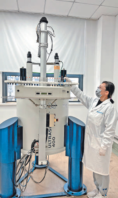 上海市張江藥谷公共服務平台技術人員在操作核磁共振檢測儀。