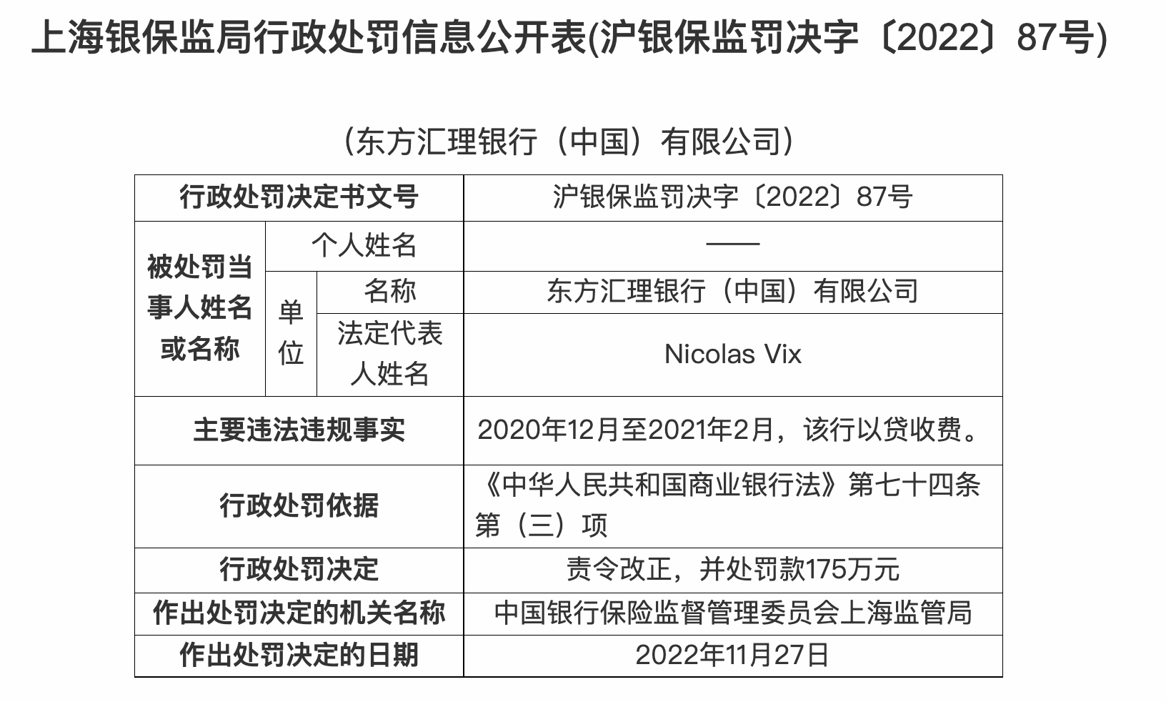 另據滬銀保監罰決字〔2022〕87號,東方匯理銀行(中國)有限公司被罰175萬元,主要違法違規事實為2020年12月至2021年2月,該行以貸收費。