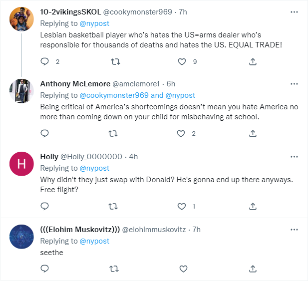除了對放走維克托不滿外,也有不少美國網民對換回來的格里納也頗有微詞。因為此前有資料顯示,格里納多次在網絡發表批評美國體制的言論,此外她吸食大麻、宣揚性少數主張的言行也讓不少美國的保守派頗為不喜,因此有網民嘲諷:“拿一個恨美國的女同性戀運動員,交換一個該為成千上萬美國人的死亡負責的軍火商,這可真是公平交易”。