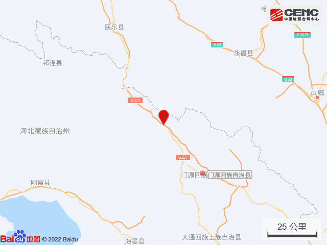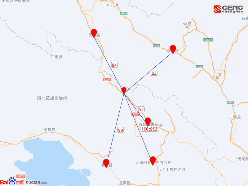 周邊縣城: 震中距門源回族自治縣52公里、距甘肅永昌縣83公里、距甘肅民樂縣84公里、距海晏縣99公里、距大通回族土族自治縣100公里,距海北藏族自治州95公里,距西寧市135公里。