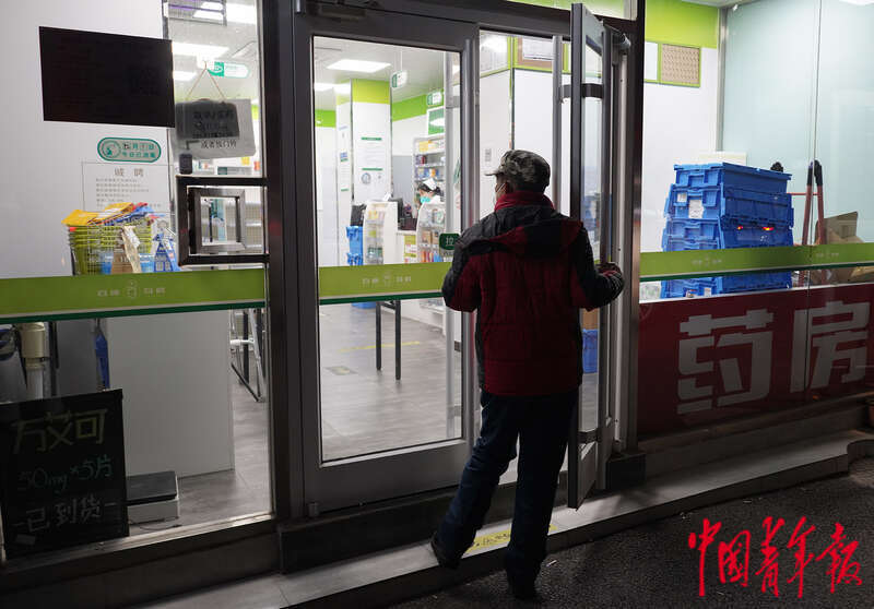 12月9日晚7點,北京市朝陽區,首都醫科大學附屬北京朝陽醫院發熱門診附近,一位老人得知藥店已經沒有體温計,準備離開。中青報·中青網記者 李崢苨/攝