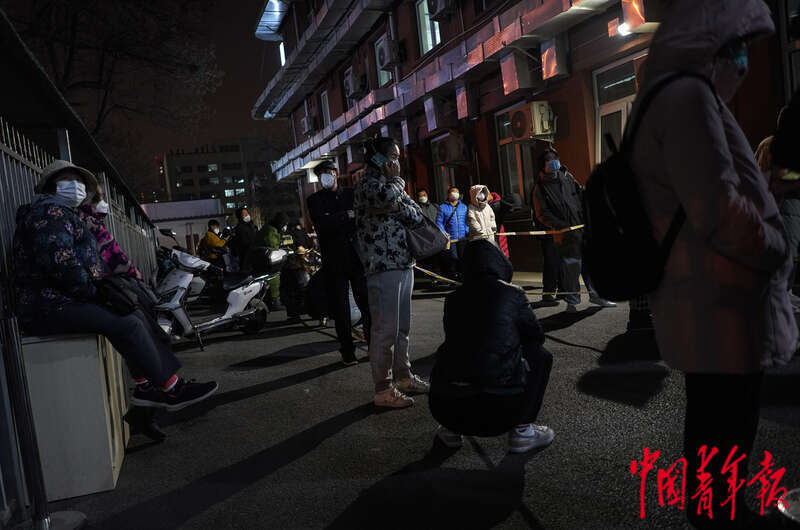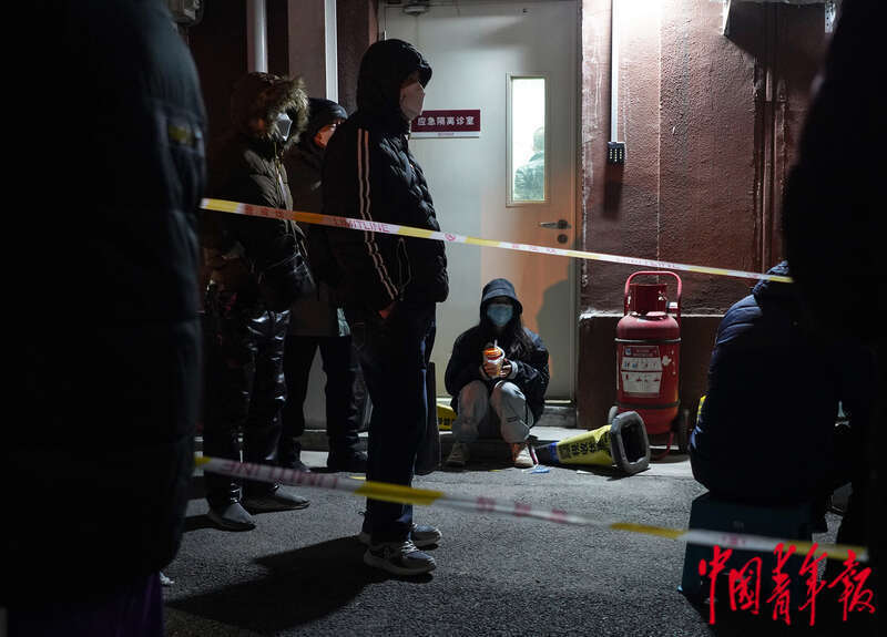 12月9日晚8點,北京市朝陽區,首都醫科大學附屬北京朝陽醫院發熱門診前,排隊等待就診的市民。其中有人從當日下午兩點開始排隊,等候時間已超6小時。有醫療專家呼籲公眾:發熱門診門口大排長隊,如果只是輕微不適就不要給自己增大感染風險,衷心希望大家非必要不來醫院,減輕發熱門診的壓力,既是保護醫務人員,也是保護自己。中青報·中青網記者 李崢苨/攝
