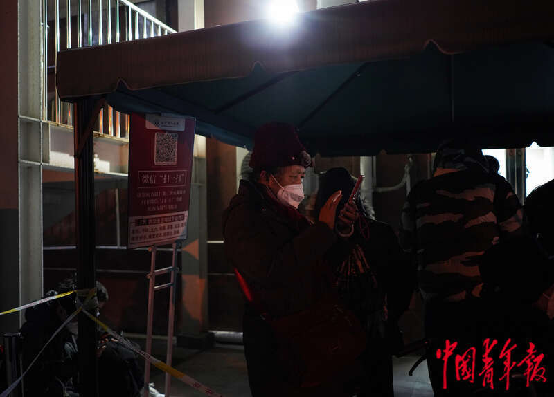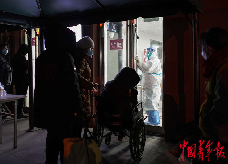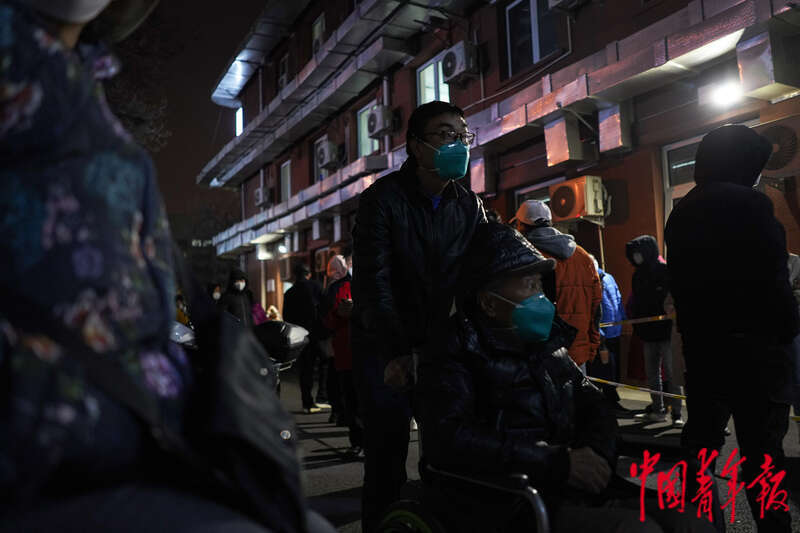 12月9日晚8點,北京市朝陽區,首都醫科大學附屬北京朝陽醫院發熱門診前,排隊等候就診的市民,其中有不少行動不便需要藉助輪椅出行的老人。中青報·中青網記者 李崢苨/攝