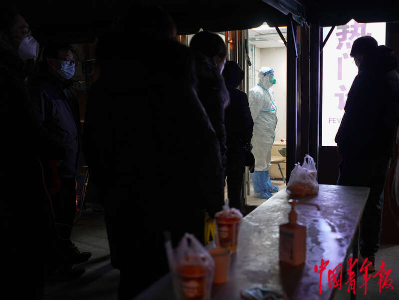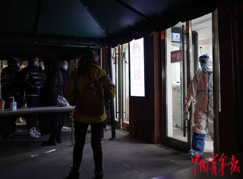 12月9日晚8點,北京市朝陽區,首都醫科大學附屬北京朝陽醫院發熱門診前,排隊等候就診的市民。中青報·中青網記者 李崢苨/攝