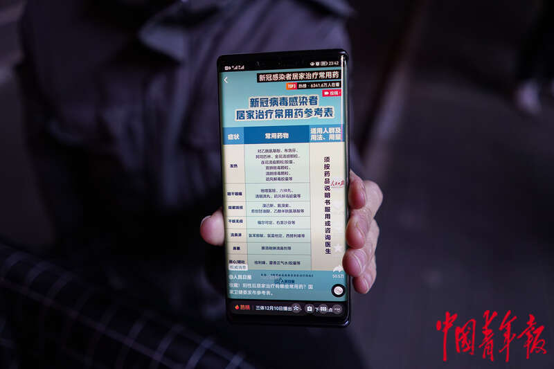 12月9日晚7點,北京市朝陽區,首都醫科大學附屬北京朝陽醫院發熱門診附近,一位在藥店門前等候的市民展示他的購藥指南:國家衞健委發佈的新冠病毒感染者居家治療常用藥參考表。他騎車轉了附近幾家藥店,按着這張表依次報藥名,直到找到仍有存貨的藥品,其中許多藥店已經斷貨。中青報·中青網記者 李崢苨/攝