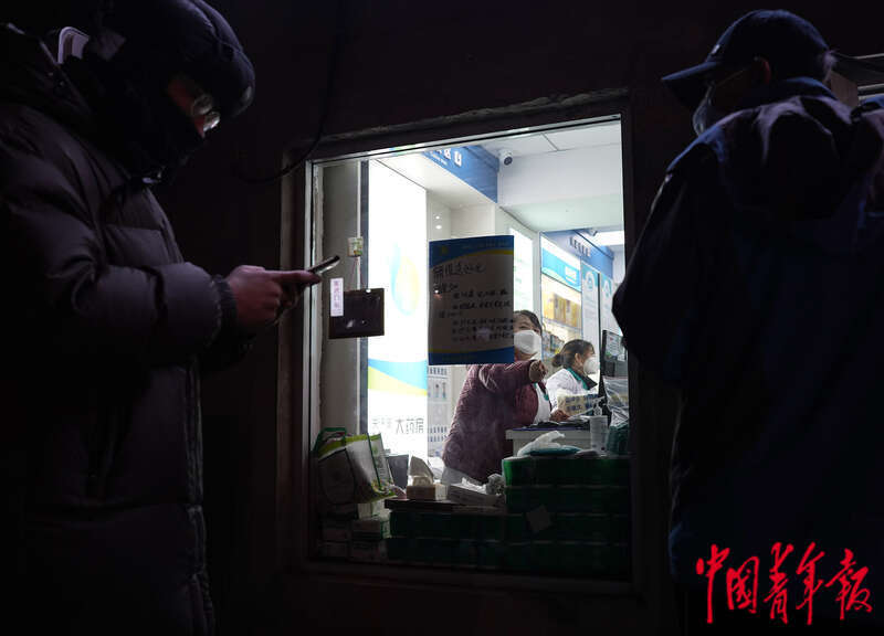 12月9日晚7點,北京市朝陽區,首都醫科大學附屬北京朝陽醫院發熱門診附近,一家藥店門前排起了隊,工作人員隔窗與排隊者溝通。中青報·中青網記者 李崢苨/攝
