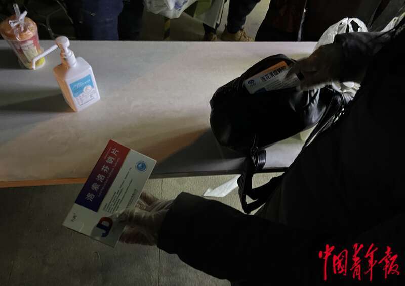 12月9日晚8點,北京市朝陽區,首都醫科大學附屬北京朝陽醫院發熱門診外,一位走出診室的女士向等候的人羣講述就診經歷。她當日下午來到醫院,此前自行做了核酸檢測,還花費187元購買了抗原自測試劑,檢測結果均為陰性。等候近6個小時後她順利就診,自述發熱等症狀後,醫生沒有安排更多檢查,給她開了3天的口服藥,分別是一盒連花清瘟顆粒和一盒洛索洛芬鈉片。其中連花清瘟顆粒當日下午在發熱門診一度斷貨,晚上才恢復供應。中青報·中青網記者 李崢苨/攝
