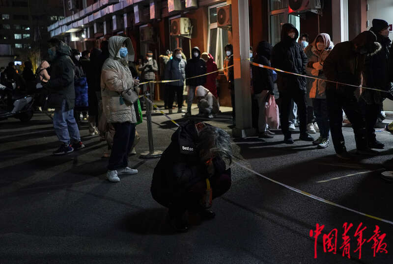 12月9日晚8點,北京市朝陽區,首都醫科大學附屬北京朝陽醫院發熱門診前,一位70多歲的老年就診者蹲在地上休息,家人在隊伍中替她排隊。她自述有血液病,體温升高到39度後撥打120,得知前面還有50人等候,就和家人自行來到醫院現場排隊就診。因等候時間過長,有許多子女替父母排隊。中青報·中青網記者 李崢苨/攝