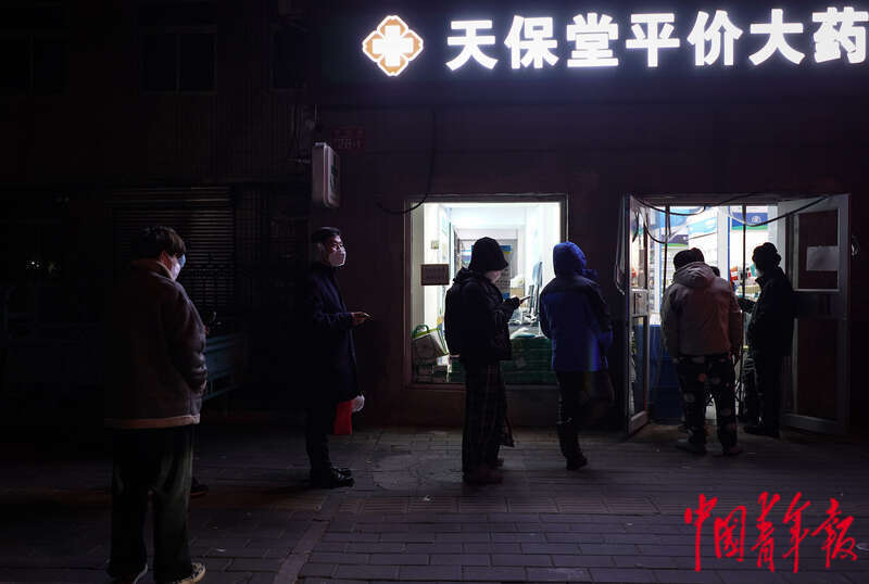 12月9日晚7點,北京市朝陽區,首都醫科大學附屬北京朝陽醫院發熱門診附近,市民在一家藥店門前排隊買藥。中青報·中青網記者 李崢苨/攝