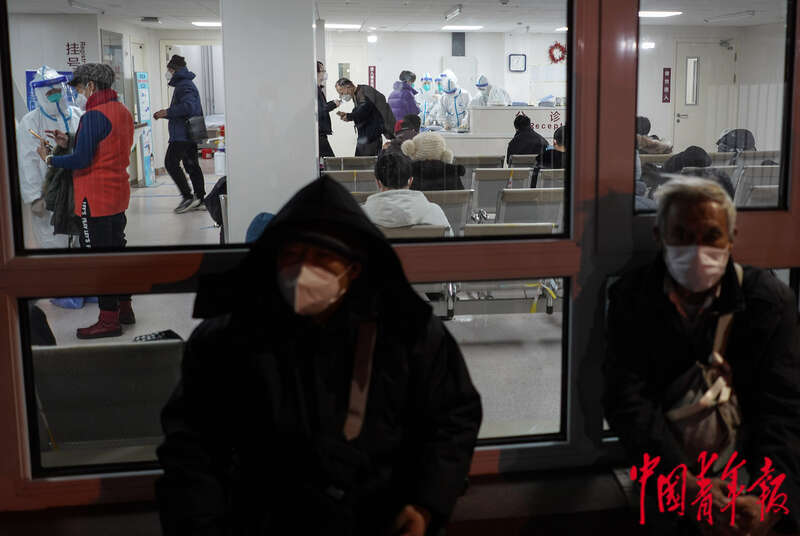12月9日晚8點,北京市朝陽區,首都醫科大學附屬北京朝陽醫院發熱門診內,室內候診區有許多市民在等待就診,室外有老人坐在窗台上等待進入室內。中青報·中青網記者 李崢苨/攝