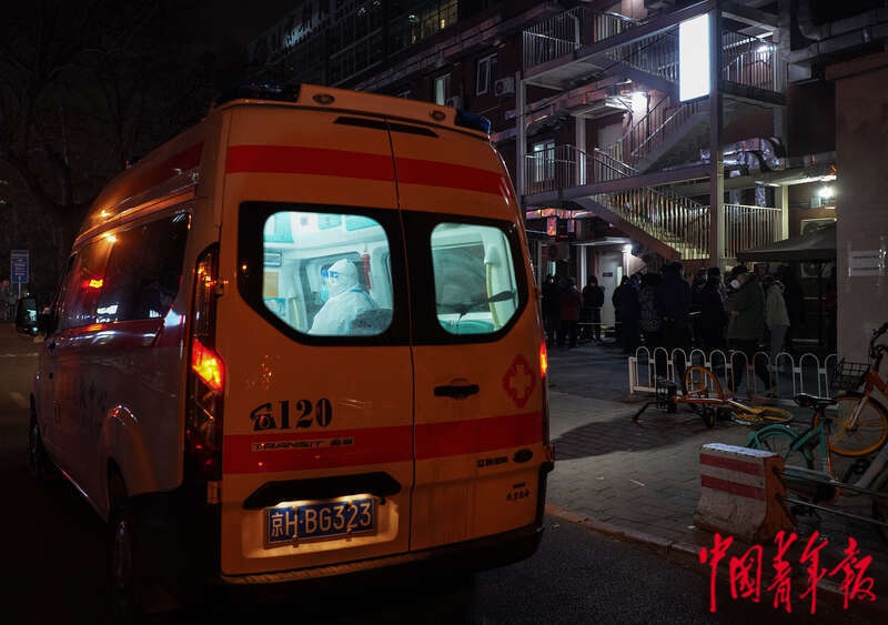 12月9日晚7點,北京市朝陽區,首都醫科大學附屬北京朝陽醫院發熱門診外,醫護人員在一輛救護車內待命。中青報·中青網記者 李崢苨/攝