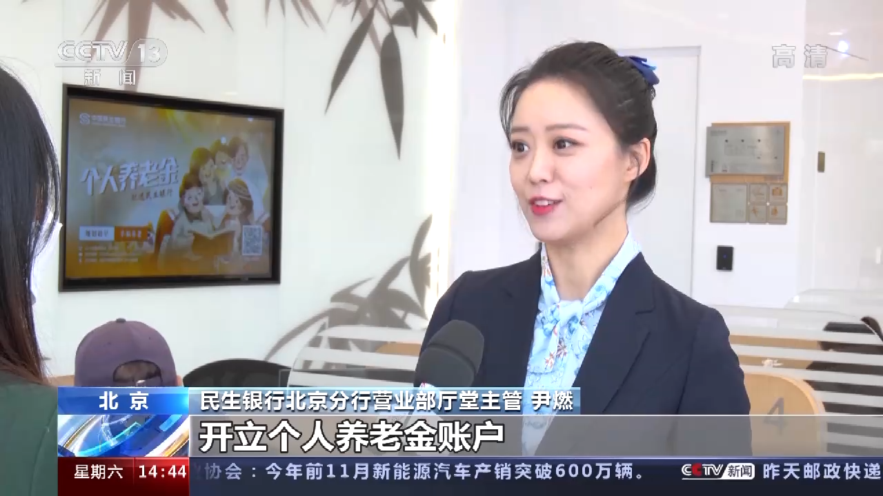 *民生銀行北京分行營業部廳堂主管 尹燃:*開立個人養老金賬户可以參與微信立減金的抽獎活動,金額大概在8塊8到388元不等,我們也是希望用這樣有趣的方式,鼓勵廣大的客户更多地參與到個人養老金的政策福利裏來。