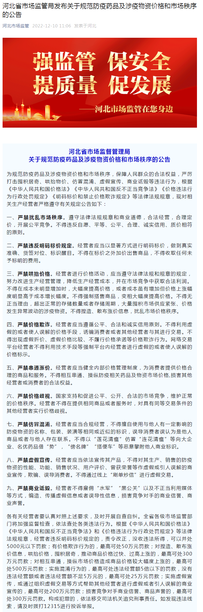 河北省市場監督管理局**關於規範防疫藥品及涉疫物資價格和市場秩序的公告