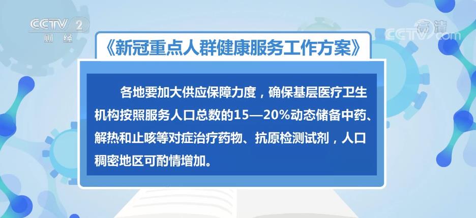 各地要加大供應保障力度,確保基層醫療衞生機構按照服務人口總數的15%—20%動態儲備中藥、解熱和止咳等對症治療藥物、抗原檢測試劑,人口稠密地區可酌情增加。