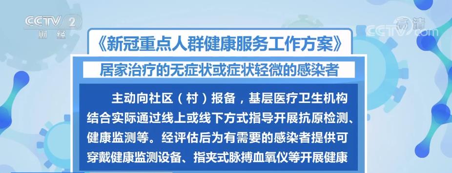 對中風險人羣開展二級服務。居家治療的無症狀或症狀輕微的感染者,主動向社區(村)報備,基層醫療衞生機構結合實際通過線上或線下方式指導開展抗原檢測、健康監測等。經評估後為有需要的感染者提供可穿戴健康監測設備、指夾式脈搏血氧儀等開展健康監測,如出現持續高熱、呼吸困難、指氧飽和度低於93%等情況應儘快轉診。基層醫療衞生機構至少每3天隨訪一次,直到居家治療觀察結束。