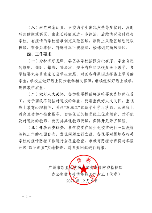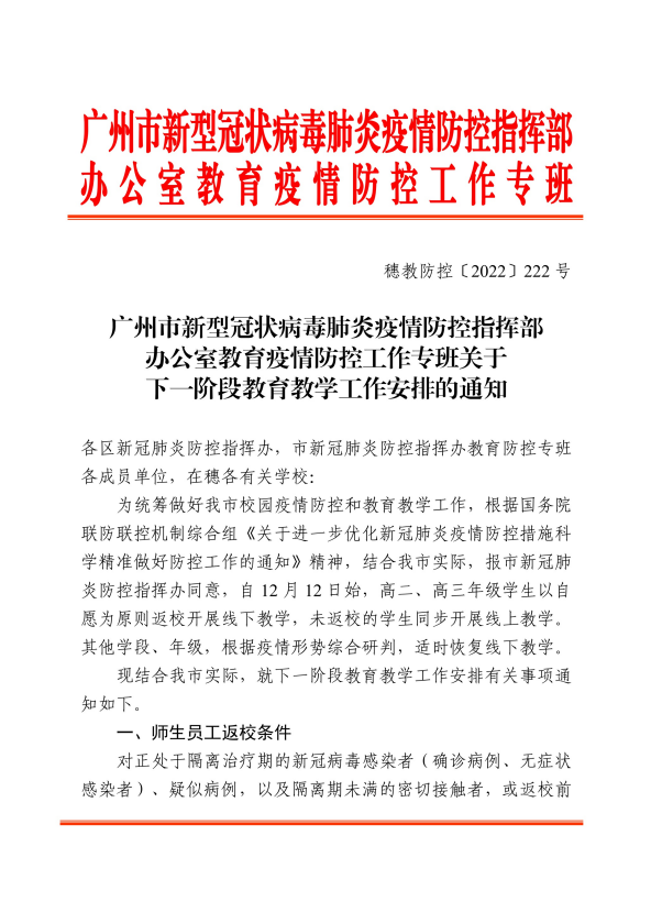 12月9日,廣州市教育局發佈《廣州市新型冠狀病毒肺炎疫情防控指揮部辦公室教育疫情防控工作專班關於下一階段教育教學工作安排的通知》(下稱《通知》),自12月12日起,高二、高三年級將恢復線下教學,對由於各種原因選擇線上學習的學生可同步開展線上教學;其他學段、年級,將根據疫情形勢綜合研判,適時恢復線下教學。在錯時、錯峯、錯層次,安全有序恢復線下教學的同時,各學校要充分尊重家長及學生意願,做好線上同步教學相關保障,並着重加強人文關懷。