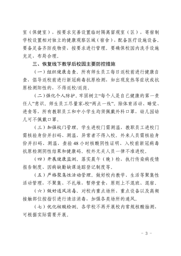 對正處於隔離治療期的新冠病毒感染者(確診病例、無症狀感染者)、疑似病例,以及隔離期未滿的密切接觸者,或返校前5天內有國內高風險區旅居史的,或8天內有境外(含港台)旅居史的,或健康碼為紅、黃碼的,或有發熱等症狀的師生員工,暫不返校。其他學生以自願為原則,返校開展線下教學。返校的師生員工(不含已封閉在校的師生員工),需持48小時核酸陰性證明進入校園。