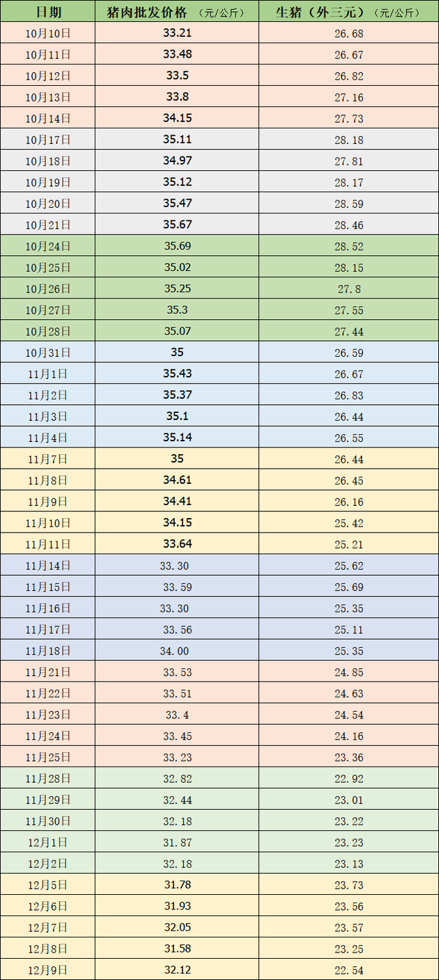 據農業農村部監測,12月9日,全國農產品批發市場豬肉平均價格為32.12元/公斤,比前一天上升1.7%;與上週五(12月2日)的32.18元/公斤相比,基本持平。本週的平均價格為31.9元/公斤,與上週的32.3元/公斤相比,下降1.2%。本週國內生豬價格呈先漲後降走勢。據中國養豬網的數據,12月9日,生豬(外三元)價格為22.54元/公斤,與上週五(12月2日)23.13元/公斤相比,下降2.6%。從周內來看,本週生豬均價為23.33元/公斤,與上週23.1元/公斤的均價相比,上漲1%。