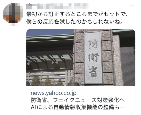 TBS稱,在俄烏衝突爆發後,使用AI技術製作的“深度偽造視頻”受到關注,日本防衞省也於今年4月新設“全球戰略情報官”一職,以防止有人用虛假新聞操縱輿論。日本防衞省計劃進一步推進在這一方面的應對。