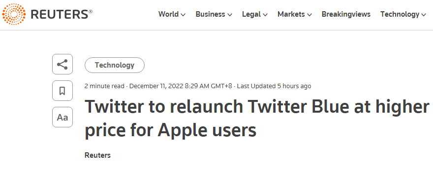 對於蘋果用户為何要每月多支付3美元一事,路透社稱,推特方面沒有具體解釋,不過該公司一直在想辦法抹去蘋果商店額外收取的費用。據此前報道,上月28日,推特新老闆馬斯克曾發數條推文,稱蘋果公司已基本停止在推特投放廣告,且蘋果威脅將把推特從其應用商店下架。馬斯克質疑,蘋果收取30%抽成費用過於高昂。不過,兩天後,“戰爭”變成了“友誼”。11月30日,馬斯克又在推文中表示,他與蘋果公司CEO庫克已“解除誤會”,庫克表示蘋果不會把推特從其應用商店中下架。