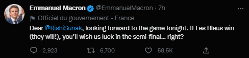 值得注意的是,本場比賽賽前,馬克龍和蘇納克曾有一番預熱互動。北京時間11日0時許,馬克龍在推特發文並@蘇納克,稱“親愛的蘇納克,期待今晚的比賽。如果法國隊贏了(他們會贏),你會在半決賽祝福我們的…… 對吧?”↓