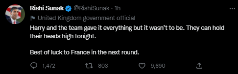 北京時間11日6時許,蘇納克在推特發文總結比賽,並祝福取得勝利的法國隊,“哈里(凱恩)和整個球隊付出了一切,但結果並非(盡如人意)。今晚他們可以昂首(離開)。祝法國隊下一輪好運。”↓