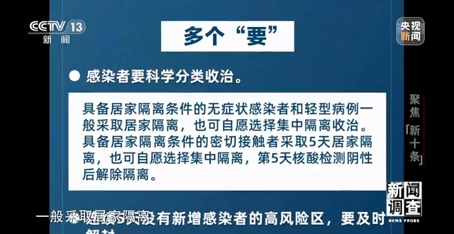 “新十條”中,首次正式明確提出具備居家隔離條件的無症狀感染者和輕型病例一般採取居家隔離,也可自願選擇集中隔離收治。同時對具備居家隔離條件的密切接觸者採取5天居家隔離,也可自願選擇集中隔離,第5天核酸檢測陰性後解除隔離。