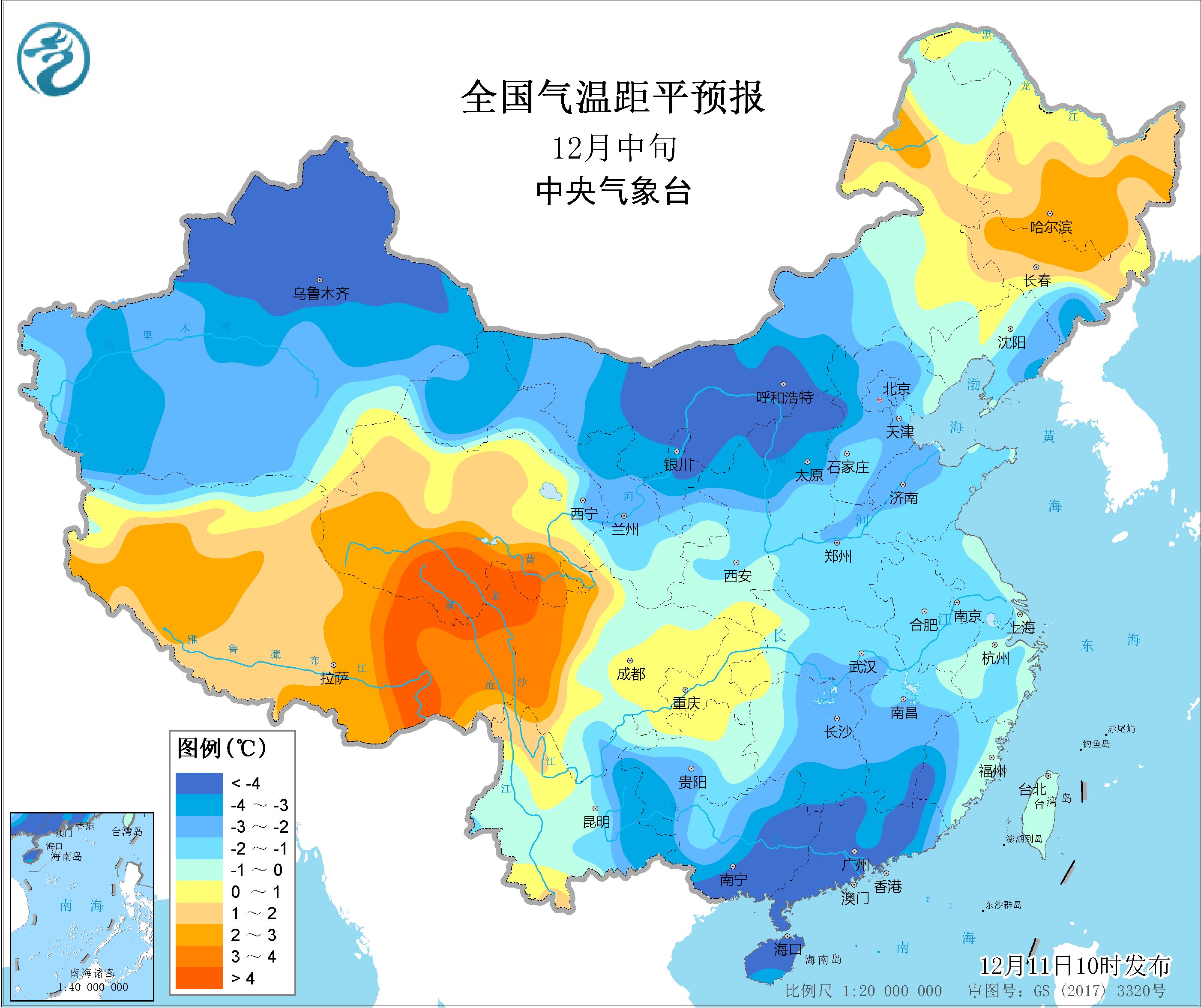 12月中旬,冷空氣活動頻繁,除青藏高原氣温偏高2~3℃外,我國大部地區平均氣温較常年同期持續明顯偏低,其中新疆、內蒙古中西部、江南西部、華南等地偏低2~4℃,局地偏低5℃以上。