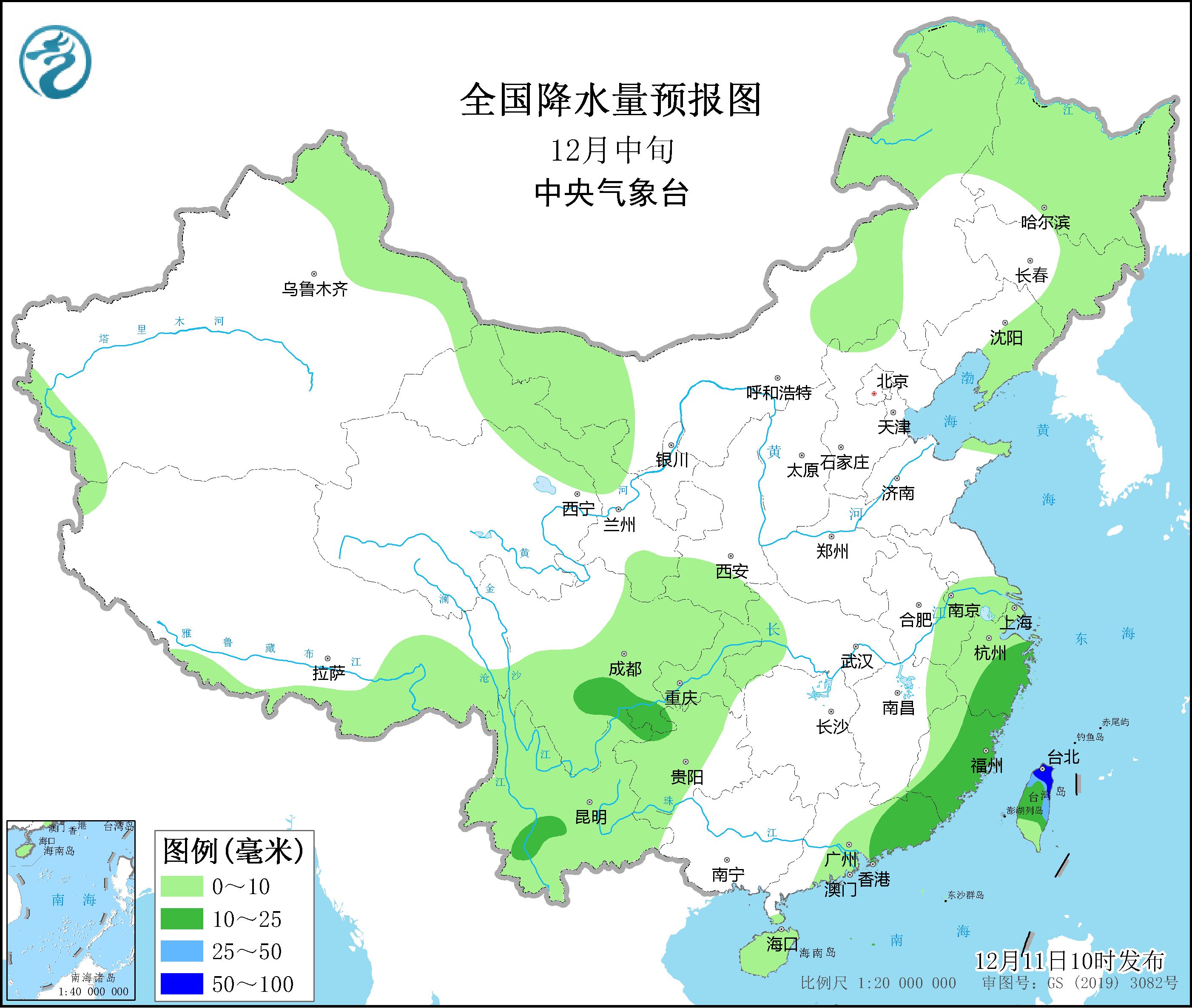 預計12月中旬,江南東部、華南東部及西南地區東部累計降水量有3~8毫米,部分地區10-20毫米;新疆東北部、內蒙古東北部、東北部分地區有3毫米左右降水,我國其餘大部地區降水稀少。