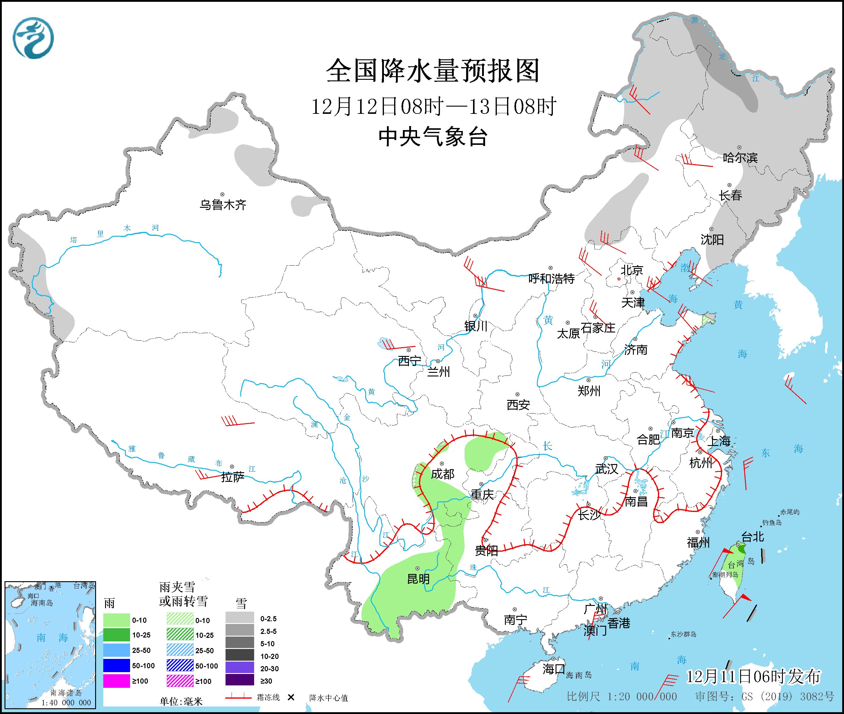 *12月11日08時至12日08時,*新疆阿勒泰和南疆盆地西部山區、內蒙古中東部、黑龍江西北部、西北地區東部等地的部分地區有小雪或雨夾雪。西南地區東部和南部、江南東南部、台灣島等地的部分地區有小雨,局地中雨。內蒙古中西部、西藏北部、華北西北部、遼東半島、山東半島、浙江北部等地的部分地區有4~6級風,其中,內蒙古西北部、甘肅河西等地部分地區有6~7級風(見圖2)。