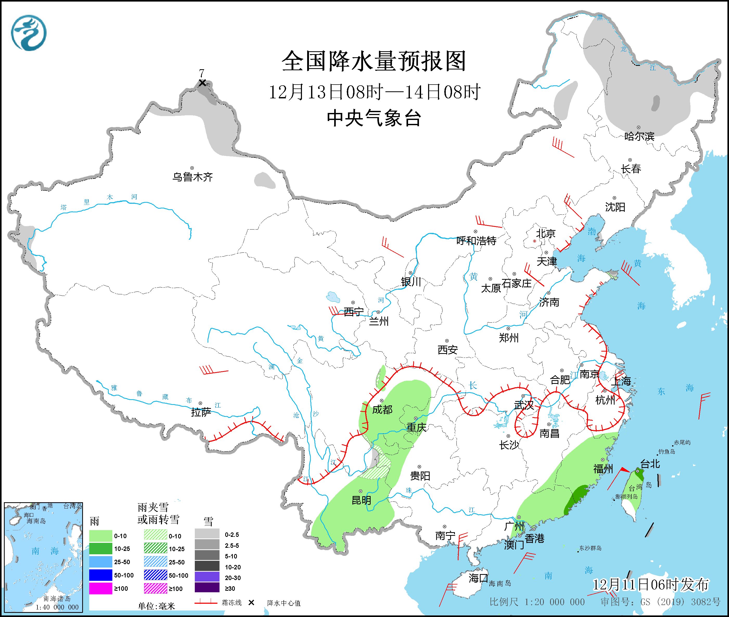 圖2 全國降水量預報圖(12月11日08時-12日08時)