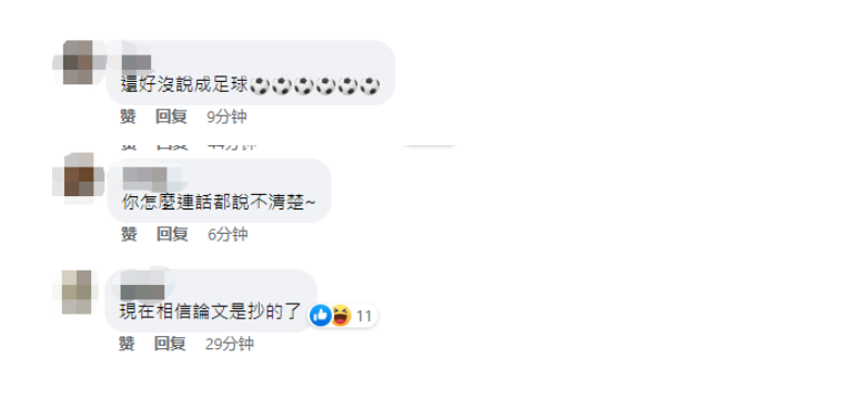 此事在臉書上也引起一些網友的議論,有人評論稱,“還好沒説成足球。”“你怎麼連話都説不清楚。”“現在相信論文是抄的了。” ↓