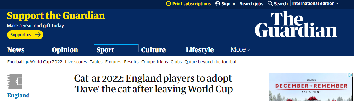 報道稱,英格蘭球員、也是曼城隊友的斯通斯和沃克收養了這隻流浪貓,並給它取了個名“戴夫”,沃克曾稱如果三獅軍團最終走到最後、拿下大力神杯,他們計劃收養這隻貓,並把它帶回英格蘭。不過,《衞報》稱,儘管夢想並未實現,但目前看來這些英格蘭球員們似乎太喜歡“戴夫”了。