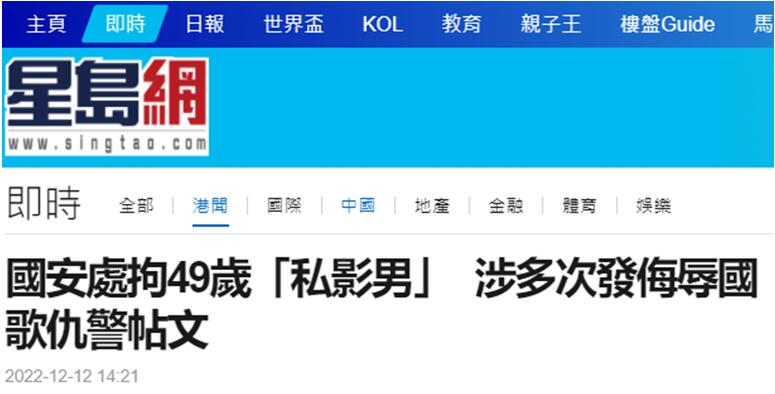 港媒:香港一男子被警方國安處拘捕,涉發佈侮辱國歌及仇警帖文